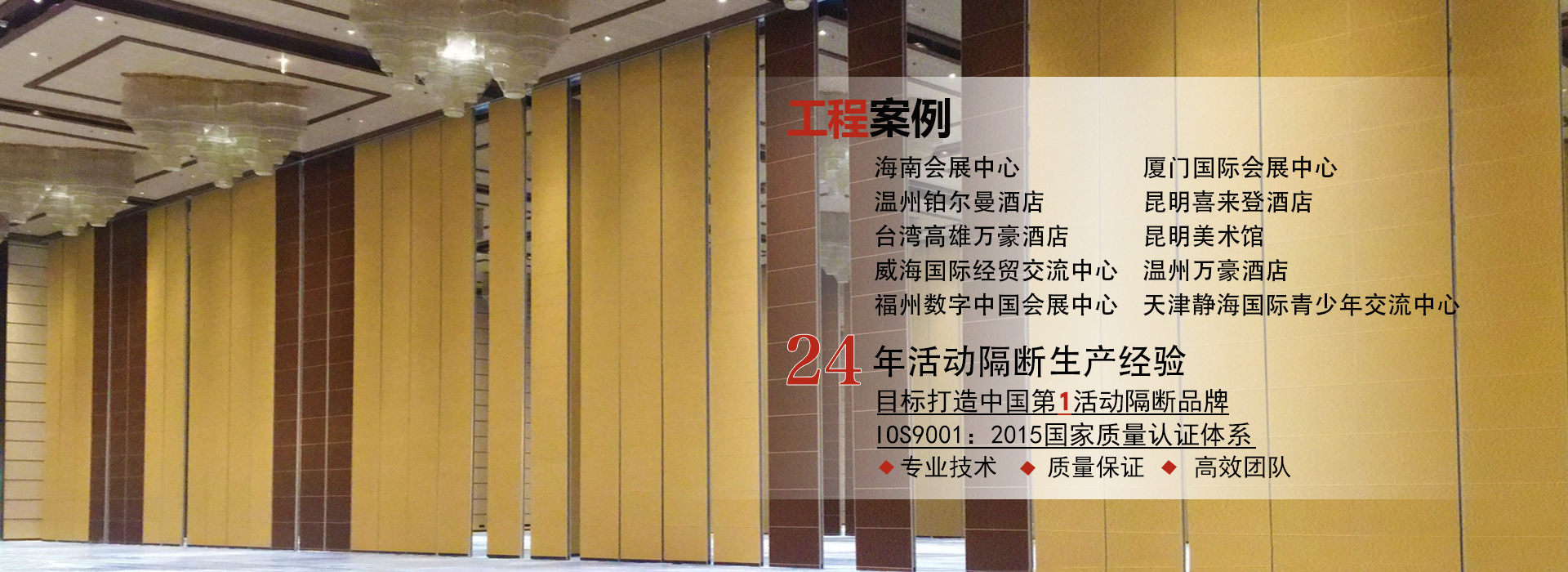 135 3317 7889 何經理/189 8866 7889李經理廣東一固隔斷制品有限公司成立于1998年,國家高新技術企業(yè),位于中國佛山市南海區(qū)里水鎮(zhèn),是一家專業(yè)從事活動隔斷和辦公室玻璃隔斷系統(tǒng)開發(fā),銷售,生產和售后服務的一站式生產廠商。公司產品廣泛應用于星級飯店,寫字樓,餐廳,宴會廳,會議中心或會展中心等商業(yè)場合,提供便捷有效的空間管理解決方案。最高門板高度可達20米,最大隔音系數可達56分貝。 一固公司擁有兩個現代化的生產基地,占地超過10,000平方米,...